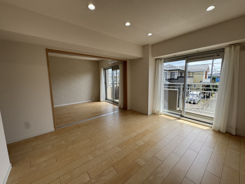 【LDK】東側に大きな開口部が設けられた開放感のあるLDK。約6.0帖の洋室が隣接しており、引き戸を開放すると一体利用が可能。約21.3帖の広々空間としてご使用いただけます。