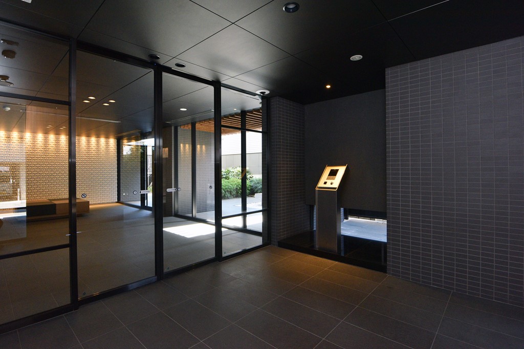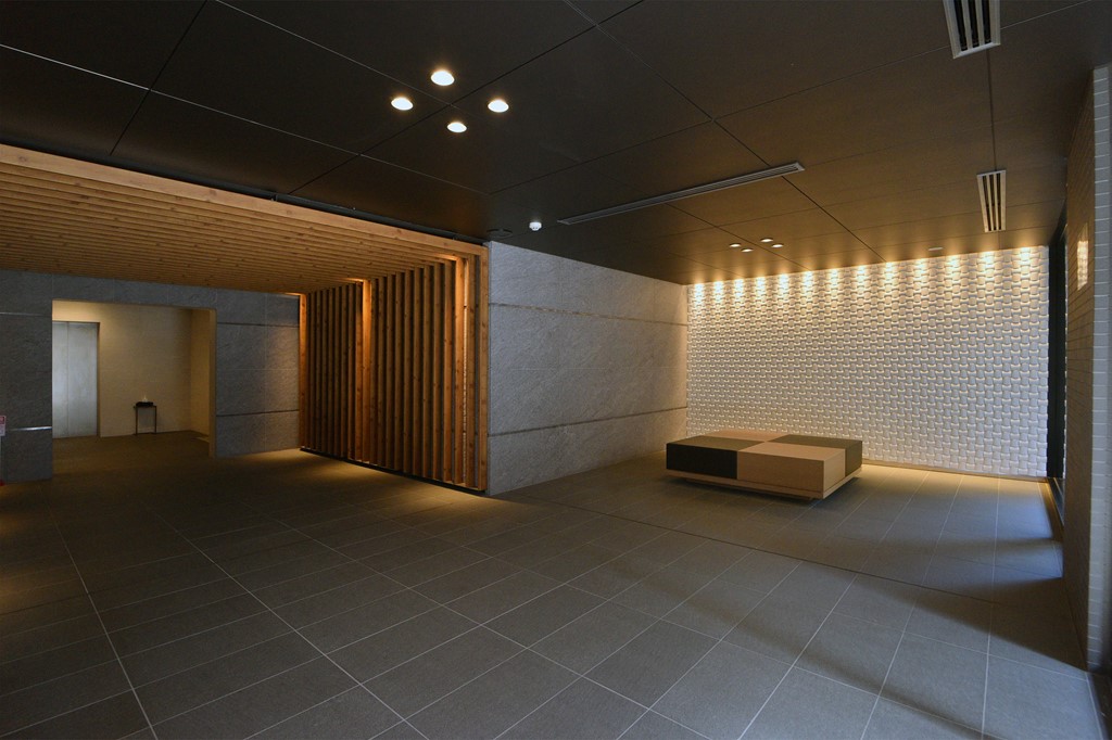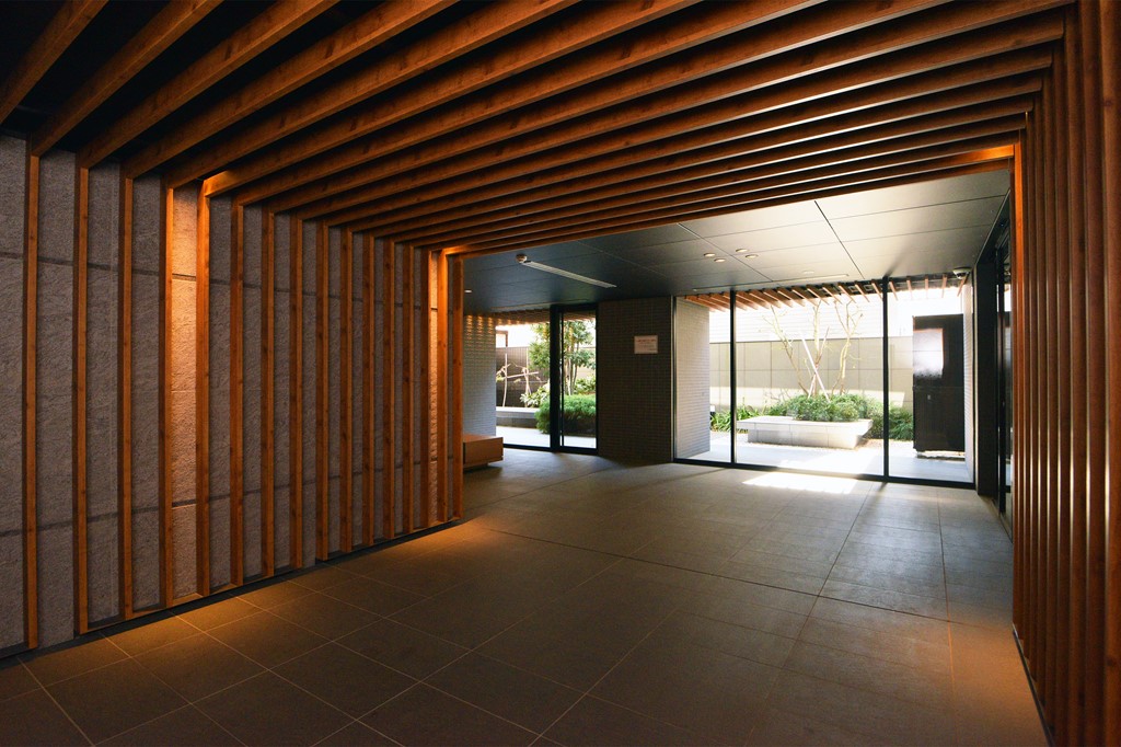 ■木目調の扉と石材を贅沢に用いた壁面で構成された格式と重厚感に満ちたエントランス