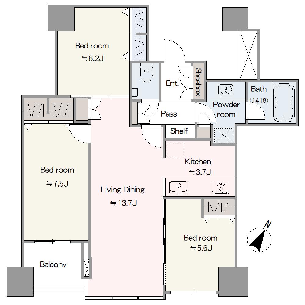| 専有面積 | 80.36㎡ | バルコニー面積 | 4.98㎡ | 間取り | 3LDK |