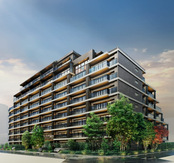 ※掲載の借景外観完成予想図は現地前写真(2023年8月撮影)に設計段階の図面を基に描き起こした外観完成予想図をCG合成したもので、形状・色等は実際とは異なる場合があります。形状の細部、設備機器等は表現していません。表現されている植栽は計画段階のものであり、変更になる場合があります。また葉の色合いや枝ぶりや樹形は想定であり、竣工から生育期間を経た状態のものを描いています。また特定の季節状態を示すものではありません。また周辺の建物の位置、高さ等については実際のものと異なる場合があります。