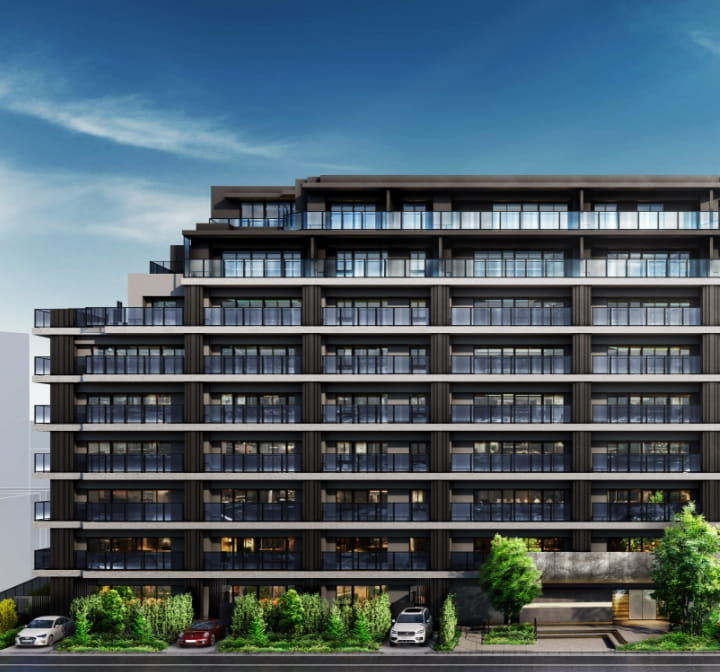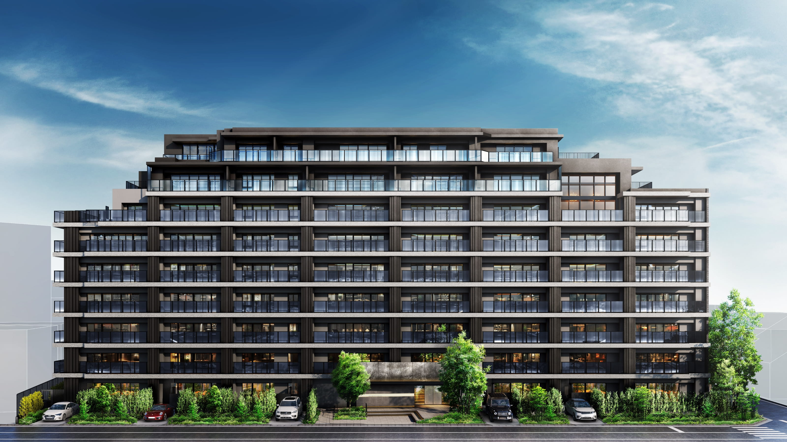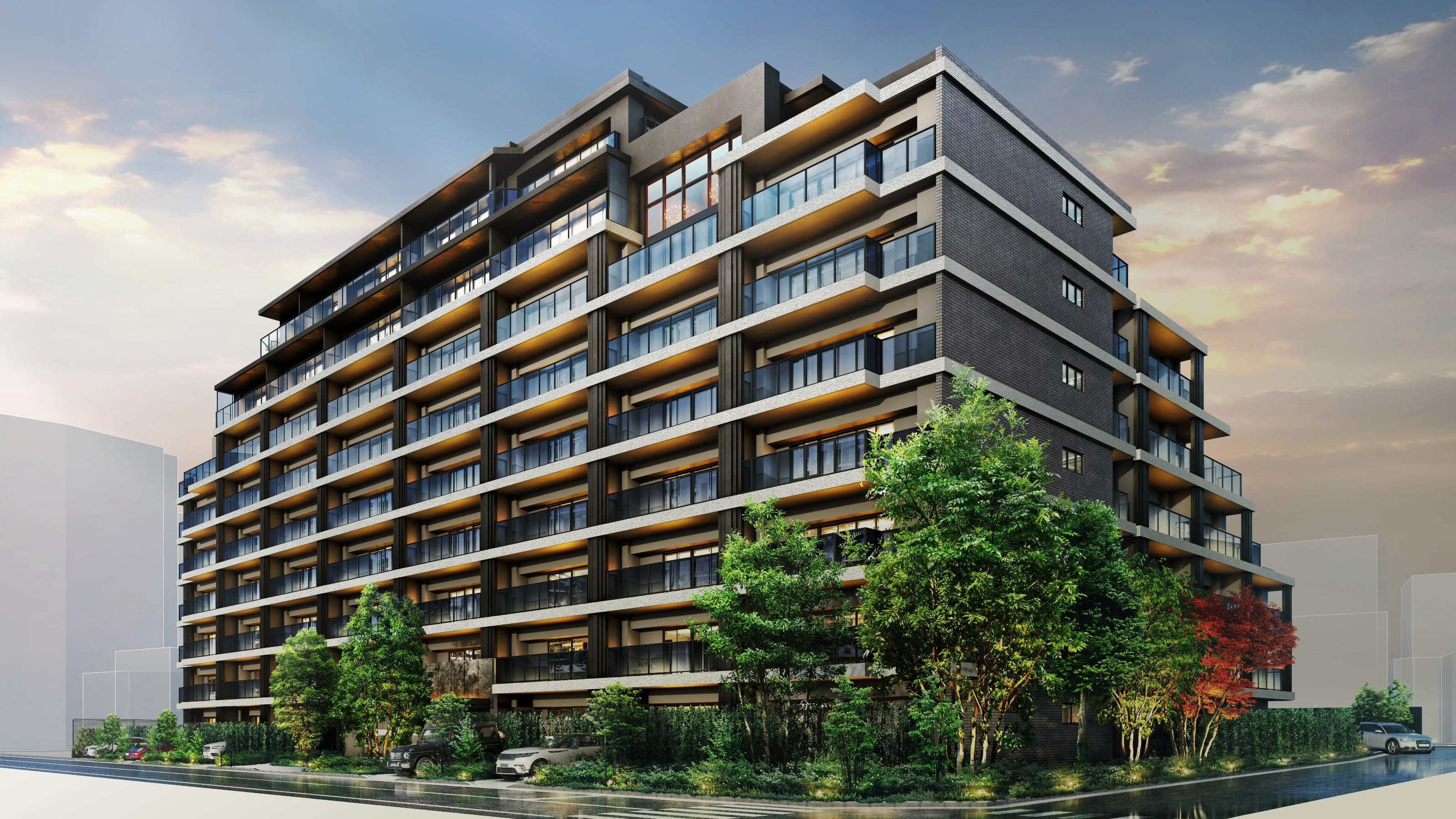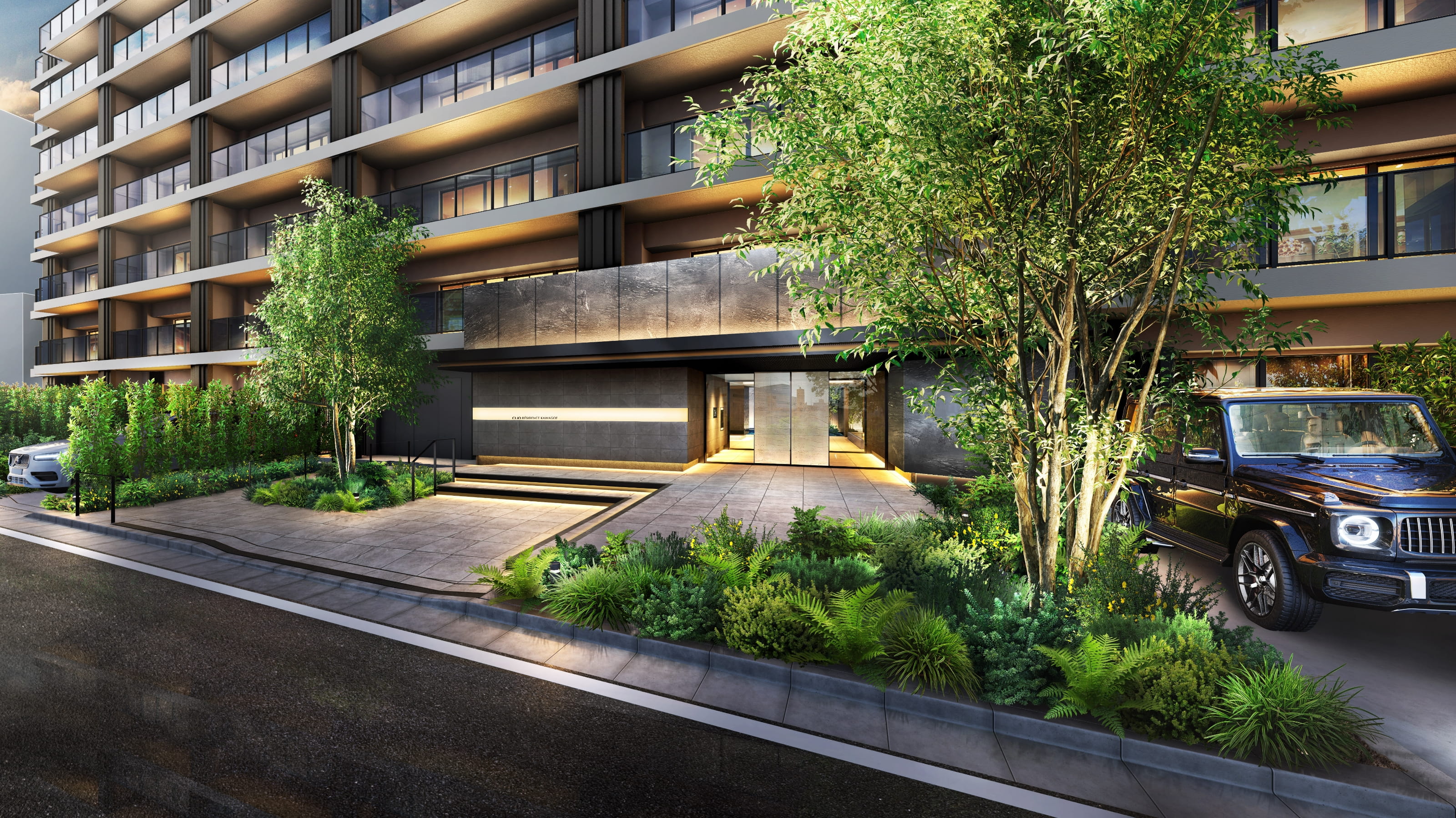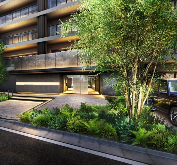 ※掲載の完成予想図は全て設計段階の図⾯を基に描き起こしたもので、形状・⾊等は実際とは異なる場合があります。形状の細部、設備機器等は表現していません。表現されている植栽は計画段階のものであり、変更になる場合があります。また葉の⾊合いや枝ぶりや樹形は想定であり、竣⼯から育成期間を経た状態のものを描いています。また特定の季節状態を⽰すものではありません。予めご了承ください。敷地周辺の建物などについては省略しています。