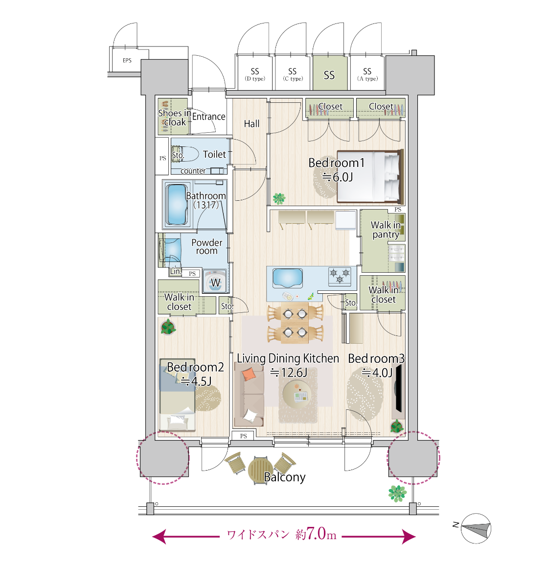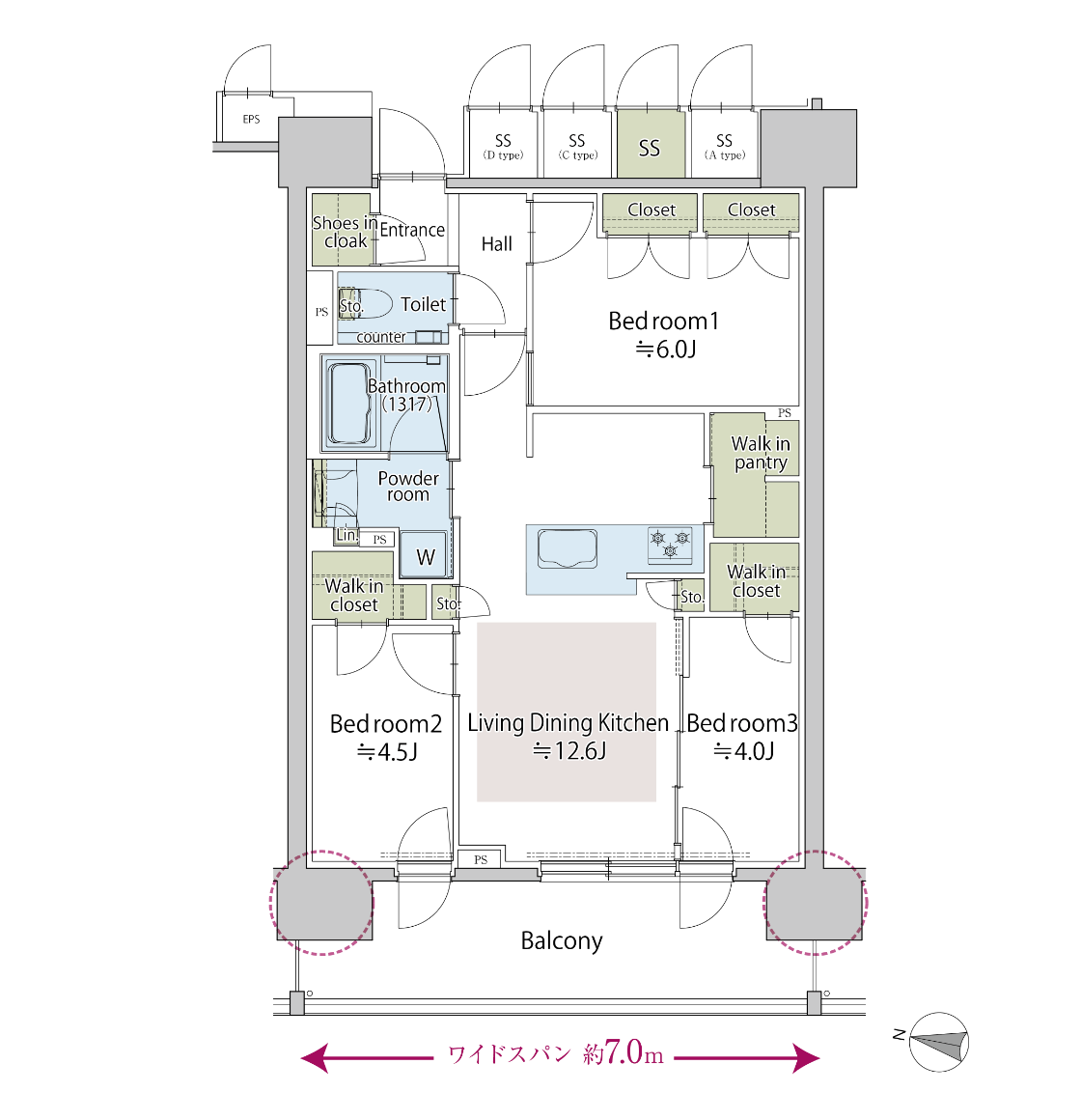 SS=備蓄倉庫 W=洗濯機置場 Lin.=リネン庫 Sto.=収納