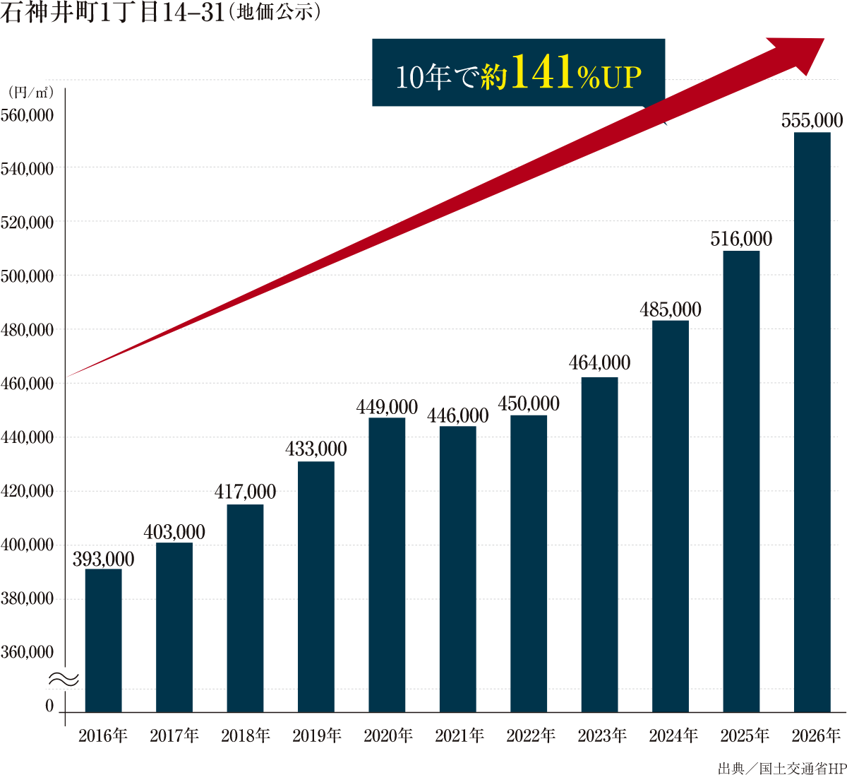 過去10年間で土地価格は約141%上昇しており、石神井公園エリアにおける需要の強さが数字にも表れています。