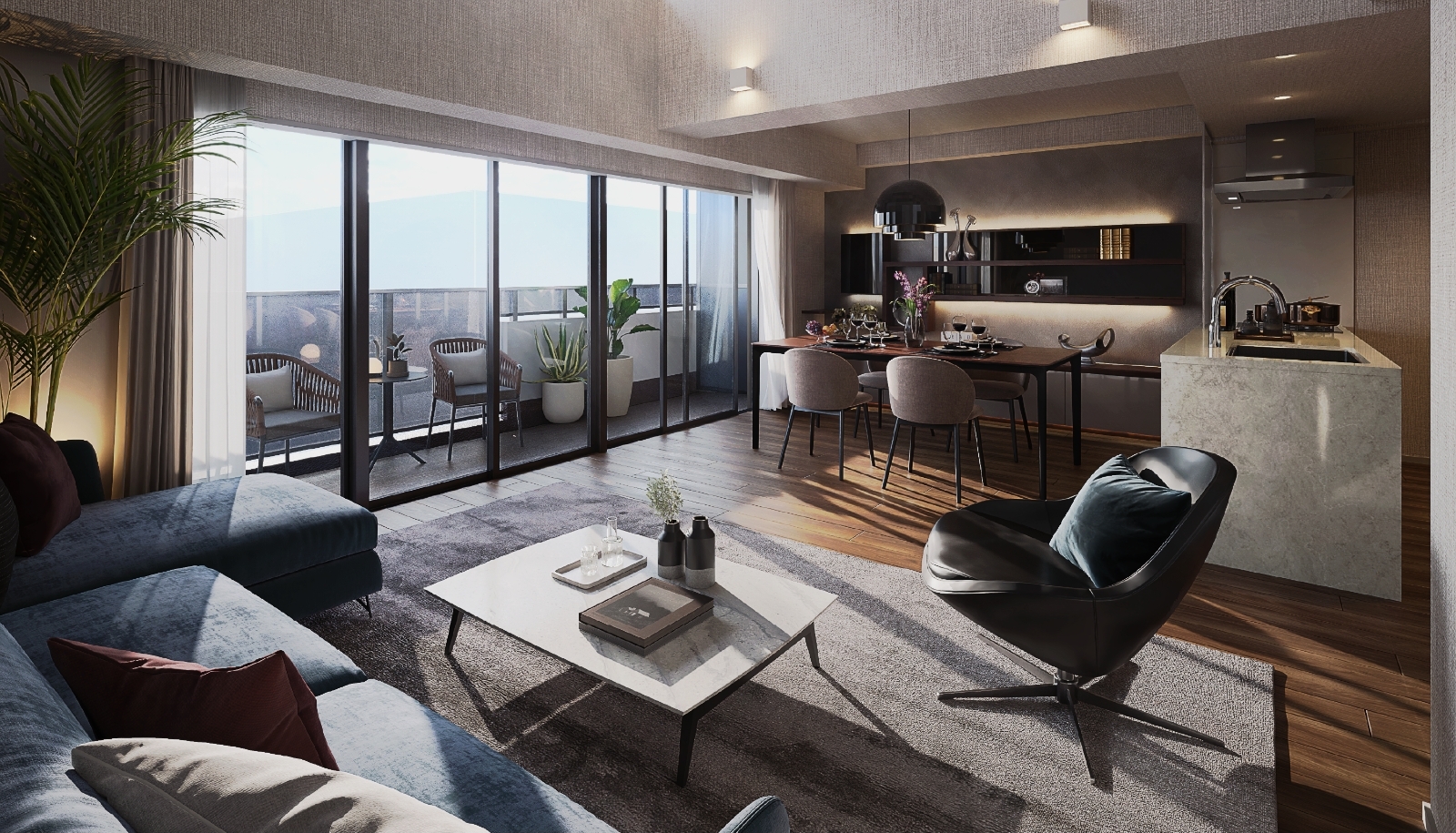 ※掲載のリビング・ダイニング・キッチン完成予想図(Kタイプ/有償設計変更プラン・分譲済)は設計段階の図⾯を基に描き起こしたもので、形状・⾊等は実際とは異なる場合があります。⼀部施⼯上変更する場合がございます。形状の細部、設備機器等は表現していません。また、家具・調度品・有償オプション等は販売価格に含まれません。