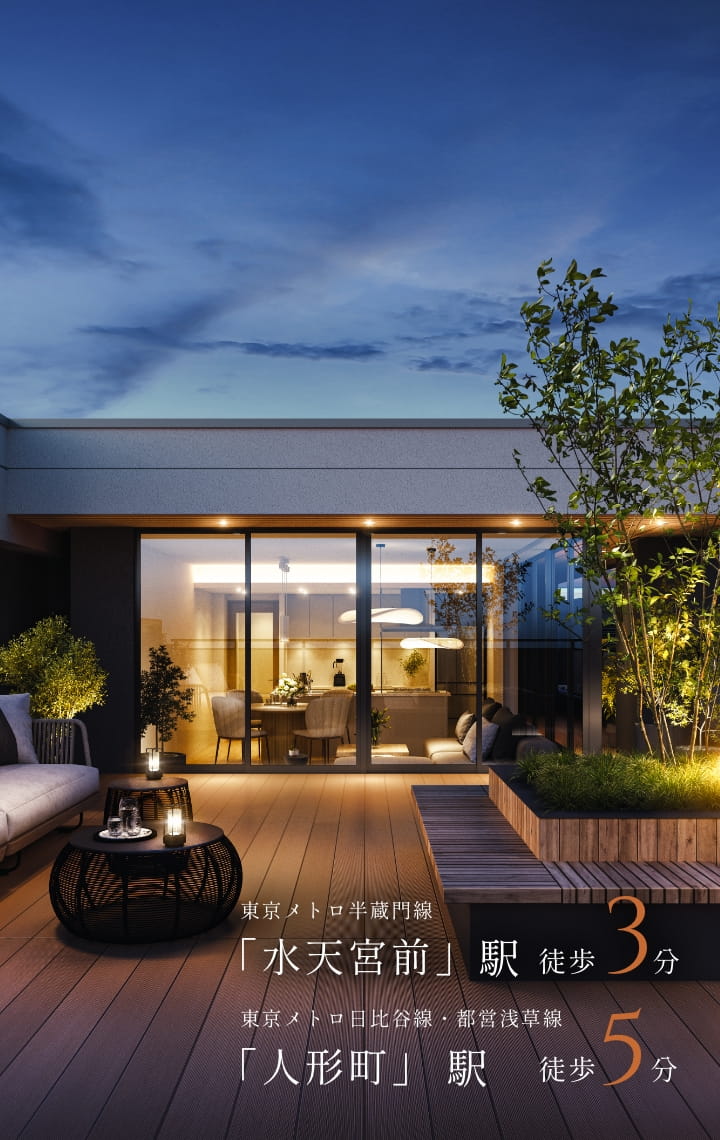 都心の利便を手中にしながら、今なお江戸の情緒が息づく唯一無二の地──「中央区日本橋人形町」。歴史と文化を受け継ぐこの街に、新たな邸宅が誕生します。東京駅1.5km圏、4駅5路線※2を自在に使いこなす軽快なアクセスが、都心の躍動と文化の薫りに満ちた上質な日常を紡ぎます。