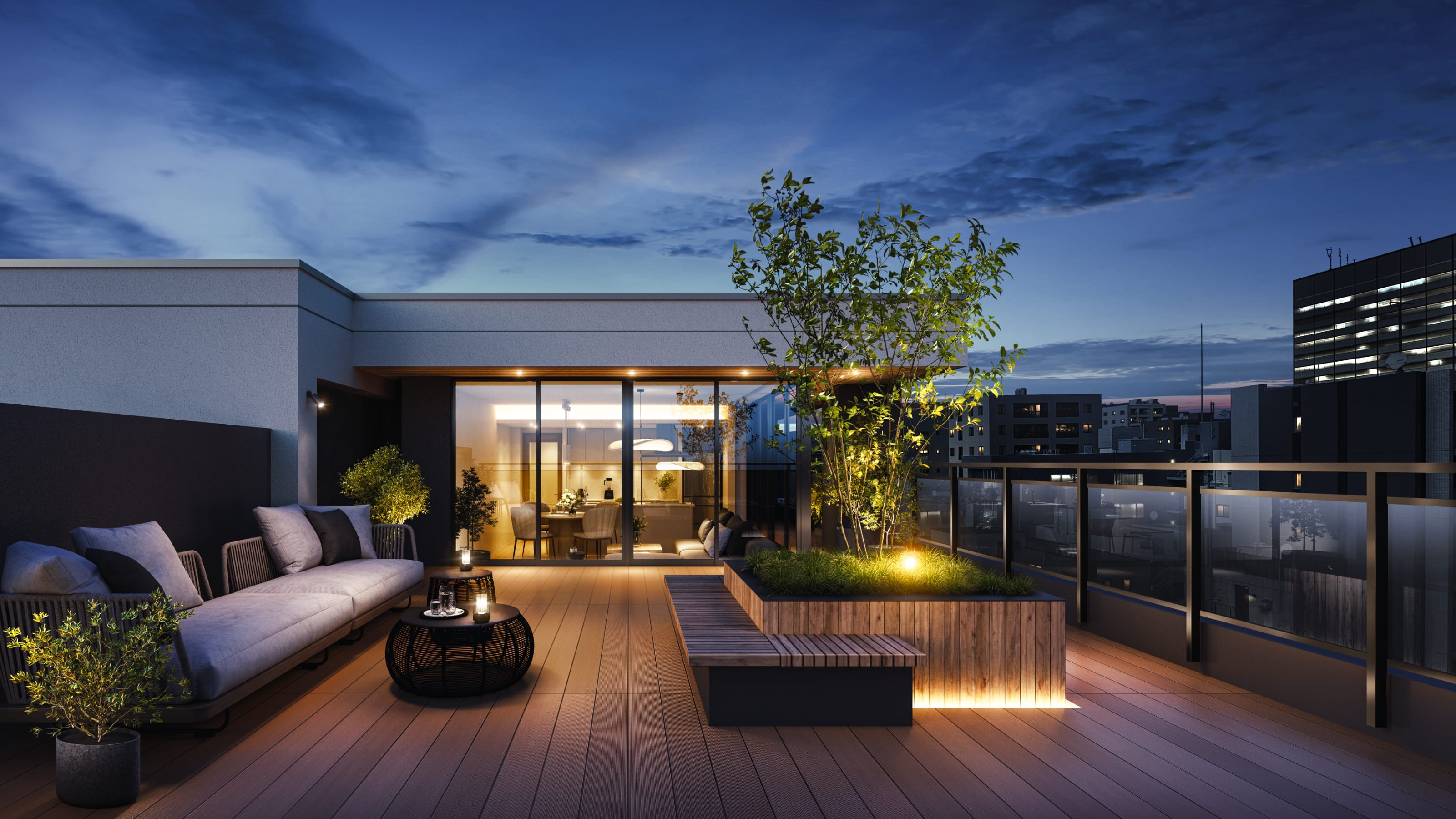 ※掲載のルーフバルコニー完成予想図(Fタイプ)は、設計段階の図面を基に描き起こしたものに現地10階相当の眺望写真(2025年10月撮影)を合成したもので、形状・色等は実際とは異なる場合があります。一部施工上変更する場合がございます。形状の細部、設備機器等は表現していません。また、家具・調度品、有償オプション等は販売価格に含まれません。