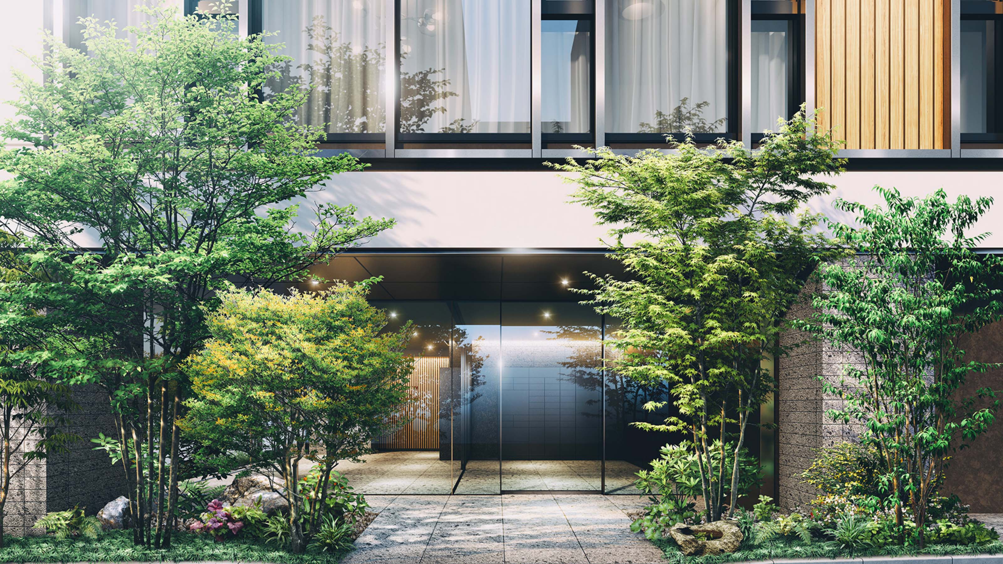 ※掲載の完成予想図は全て設計段階の図面を基に描き起こしたもので、形状・色等は実際とは異なる場合があります。形状の細部、設備機器等は表現していません。表現されている植栽は設計段階のものであり、変更になる場合があります。また葉の色合いや枝ぶりや樹形は想定であり、竣工から生育期間を経た状態のものを描いています。また特定の季節状態を示すものではありません。敷地周辺の建物などについては省略しています。