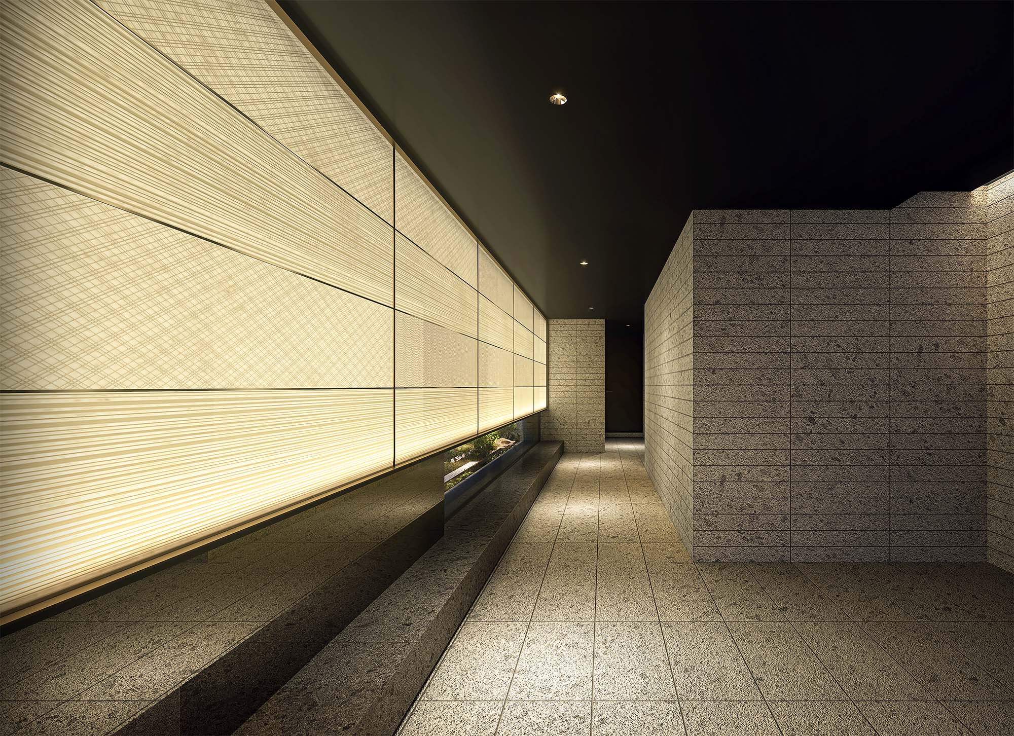 ガラス越しの光と木調アクセントが、人形町の街並みに柔らかな存在感をもたらします。