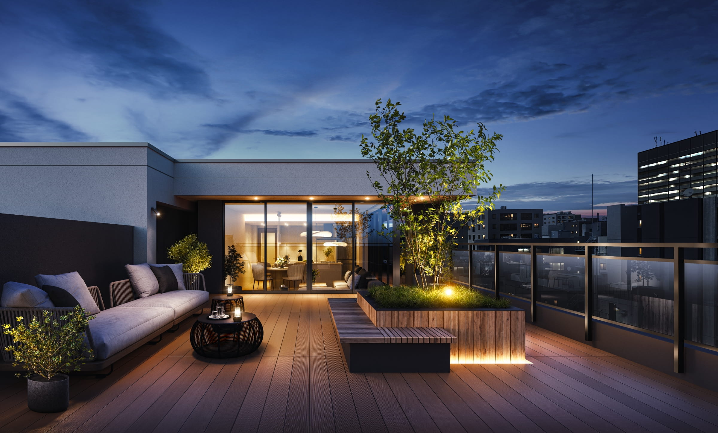 ※掲載のルーフバルコニー完成予想図(Fタイプ)は、設計段階の図面を基に描き起こしたものに現地10階相当の眺望写真(2025年10月撮影)を合成したもので、形状・色等は実際とは異なる場合があります。一部施工上変更する場合がございます。形状の細部、設備機器等は表現していません。また、家具・調度品、有償オプション等は販売価格に含まれません。