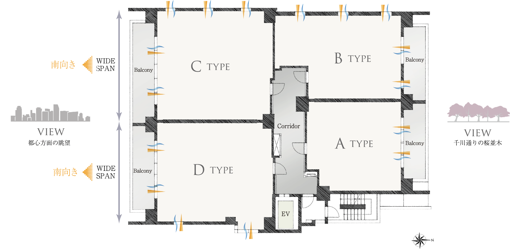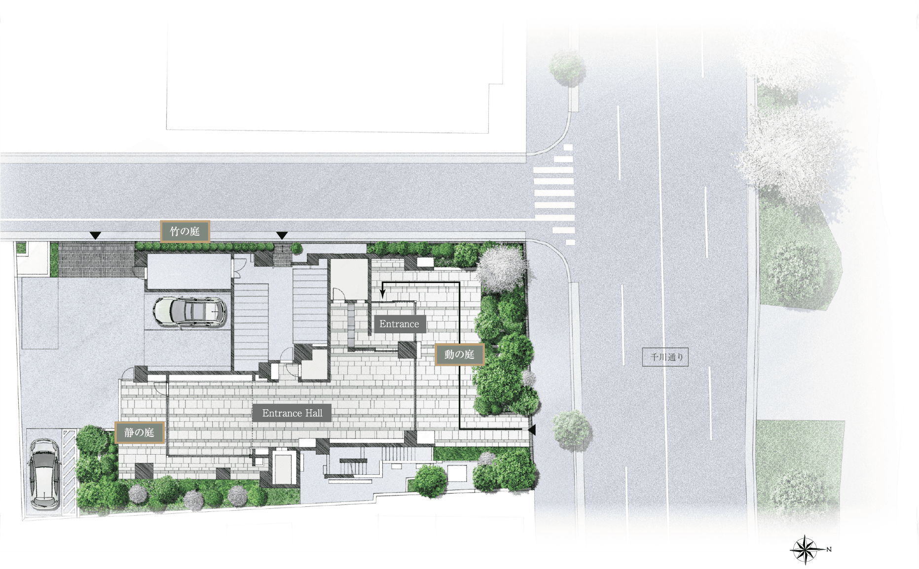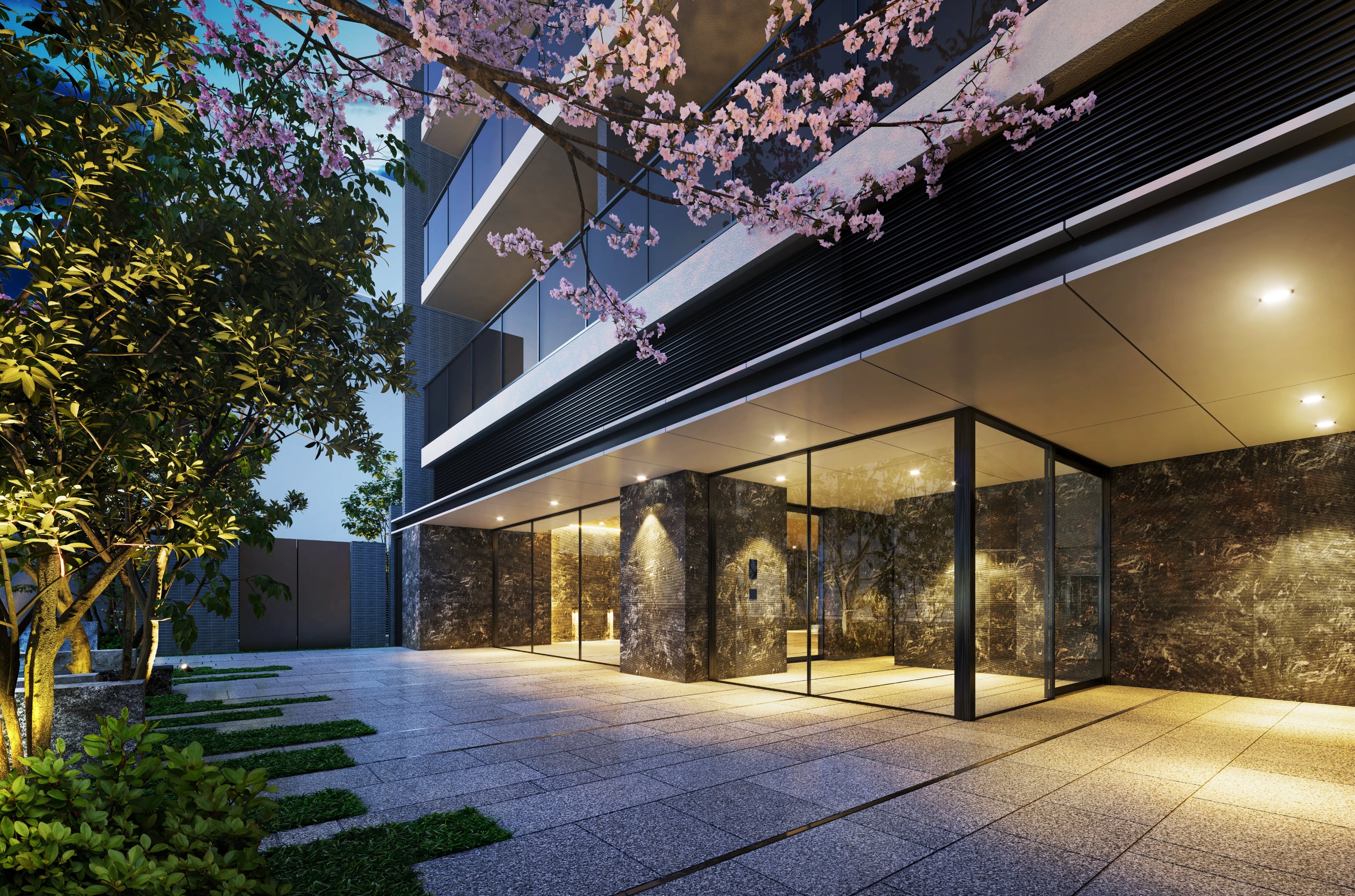 ランドスケープ。練馬らしさをコンセプトとする設計の独自性は、住まう方の誇りや愛着を醸成します。桜並木の風景と調和し、街に華やぎを添える建築デザインに加え、敷地内には練馬の歴史を紡ぐ「動の庭」「静の庭」「竹の庭」を配置。建物の外壁には、重厚で格調高いブルーグレーが基調のタイルを採用。上質なマテリアルで施した広いエントランスホールやホテルライクな内廊下などが、優雅で洗練されたパブリックスペースを創出します。