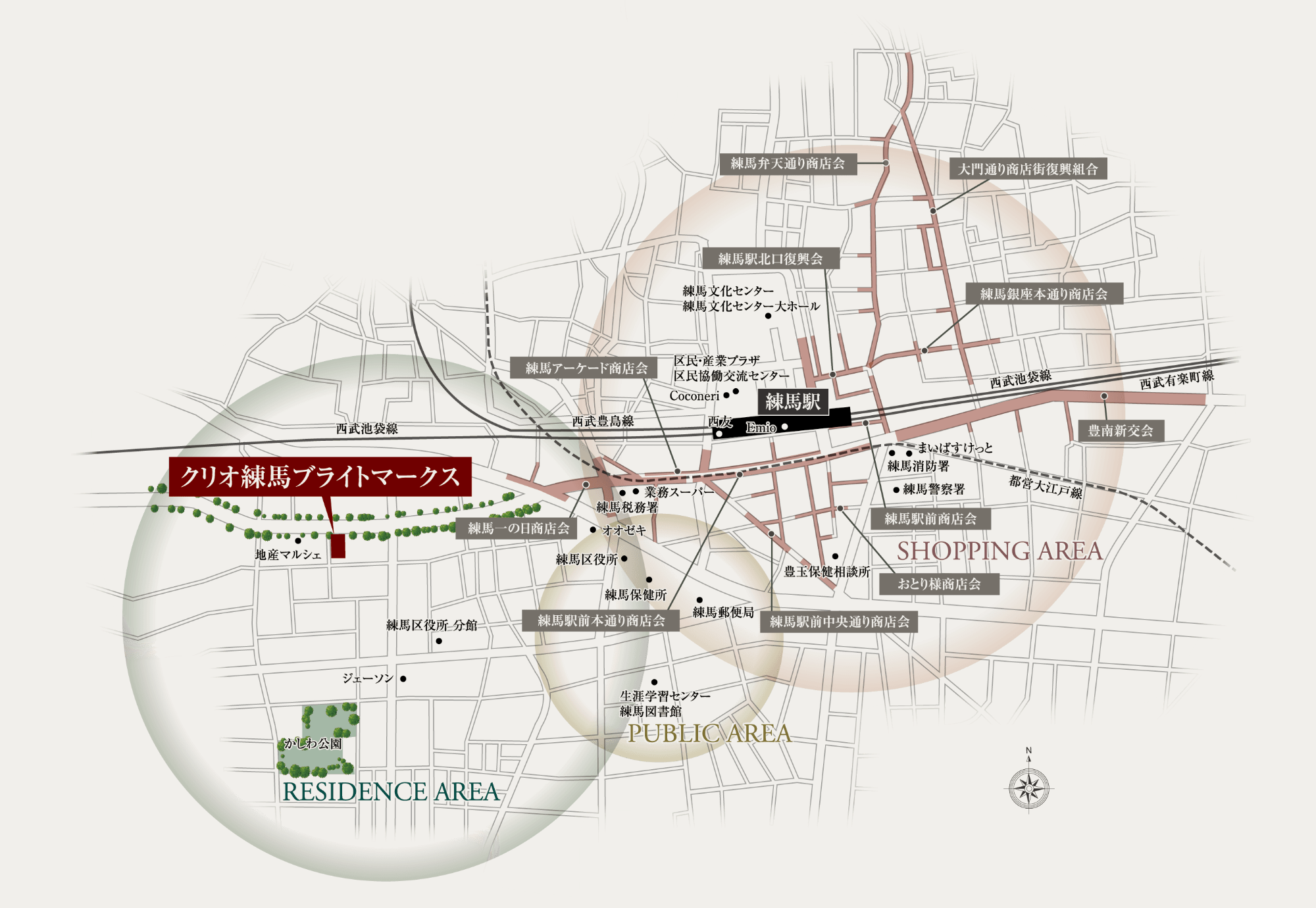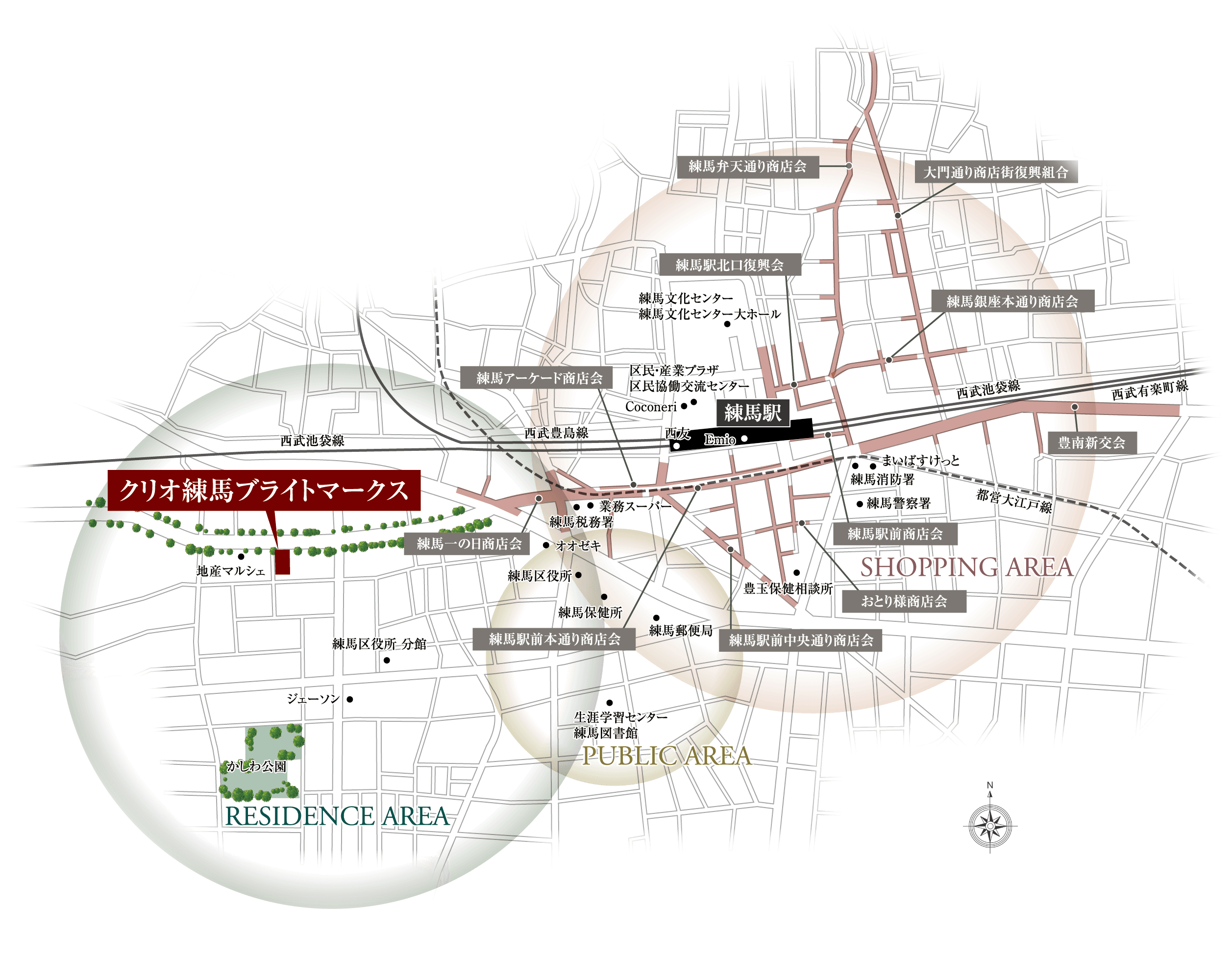 「練馬区役所」や「練馬文化センター」など、行政・文化施設が集中する区の中枢。