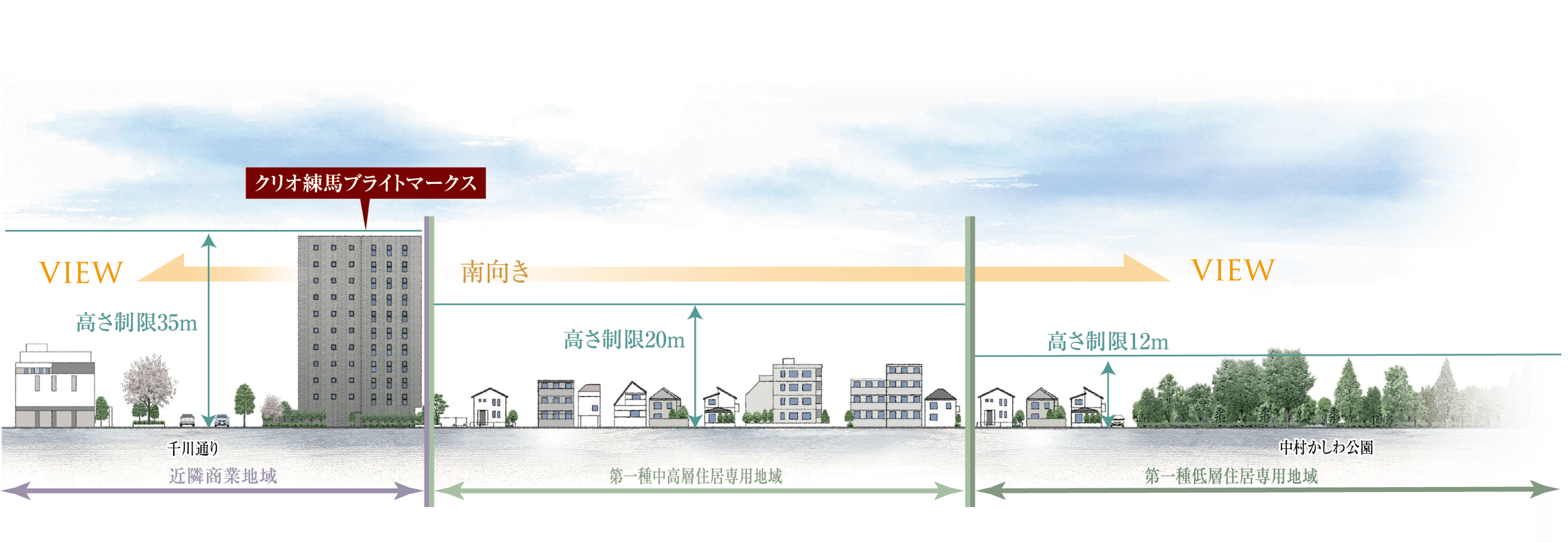 ※掲載の眺望概念イラストは周辺の⽴地を概念化しイラスト化したもので、地形・起伏・建物の⼤きさ・距離・⽅向・眺望等は実際とは異なります。また、建物の形状・⾊等は実際とは異なる場合があります。形状の細部、設備機器等は表現していません。表現されている敷地内の植栽は設計段階のものであり、変更になる場合があります。また葉の⾊合いや枝ぶりや樹形は想定であり、竣⼯から⽣育期間を経た状態のものを描いています。また特定の季節状態を表すものではありません。敷地周辺の建物・道路・植栽等は省略・簡略化しています。眺望については将来に渡って保証するものではありません。予めご了承ください。