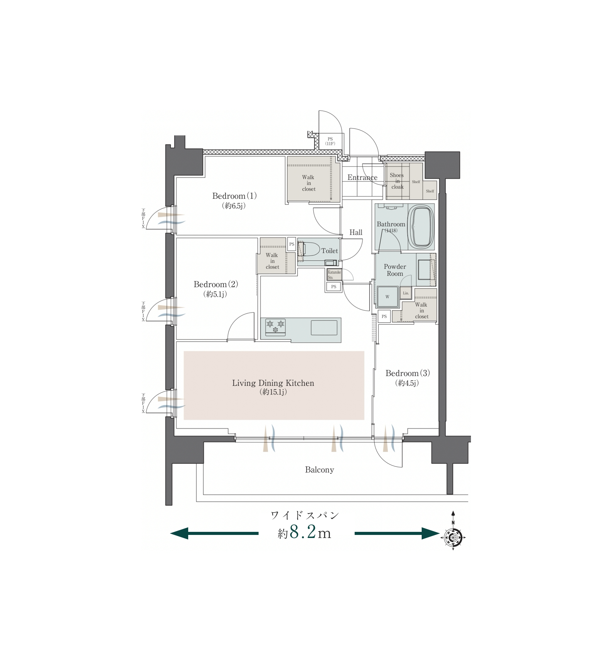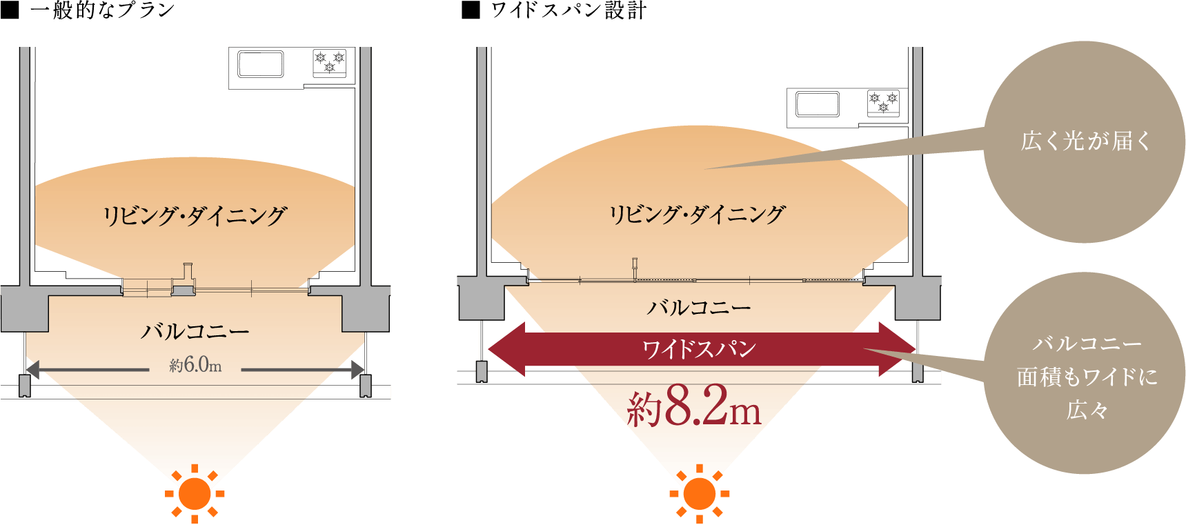 ※ワイドスパンとは、バルコニー⾯の開⼝部が7.0m以上の住⼾を表現しています。