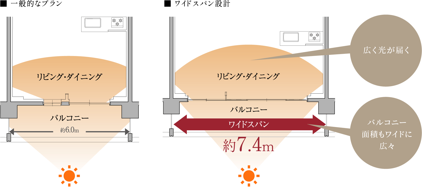 ※ワイドスパンとは、バルコニー⾯の開⼝部が7.0m以上の住⼾を表現しています。