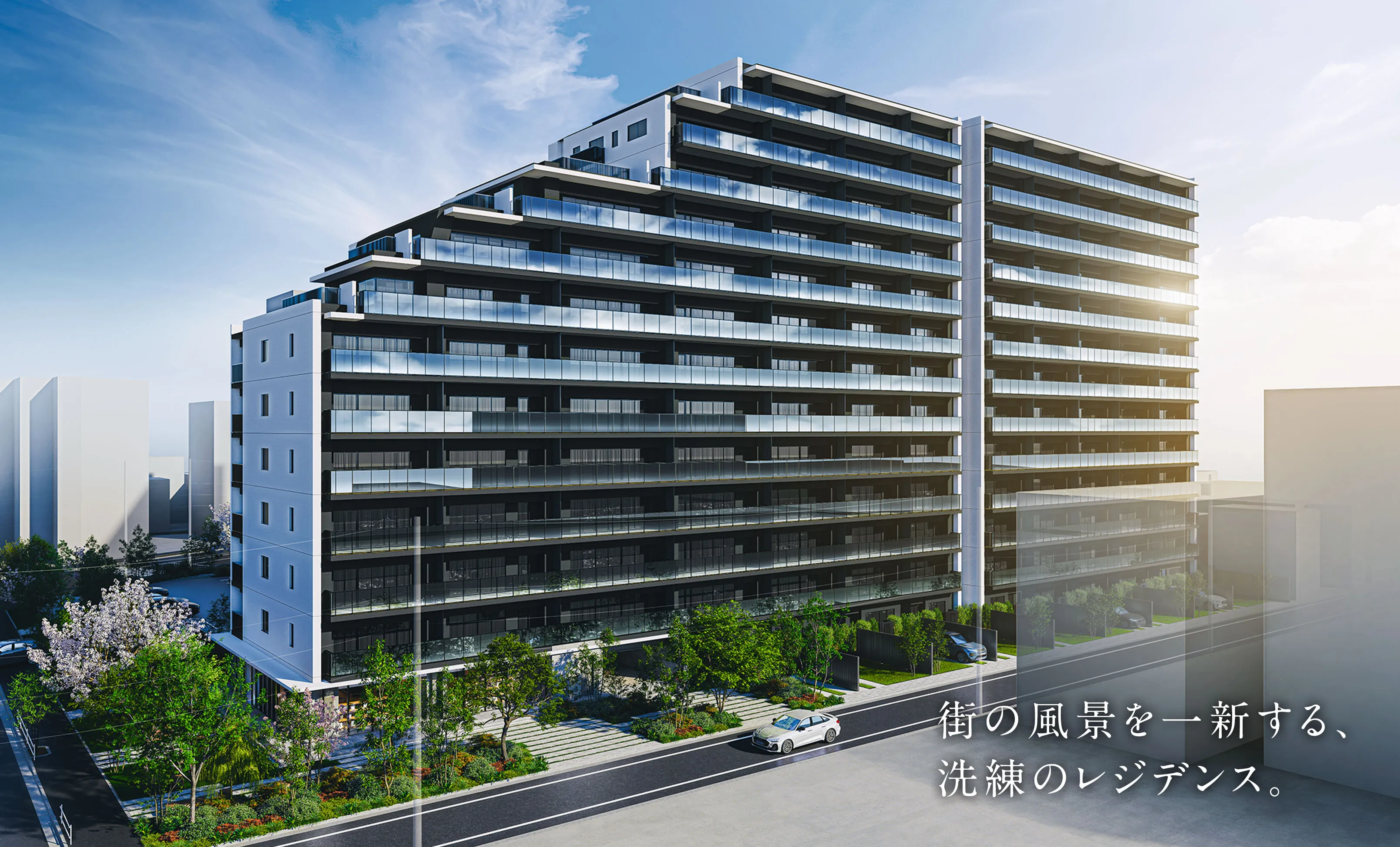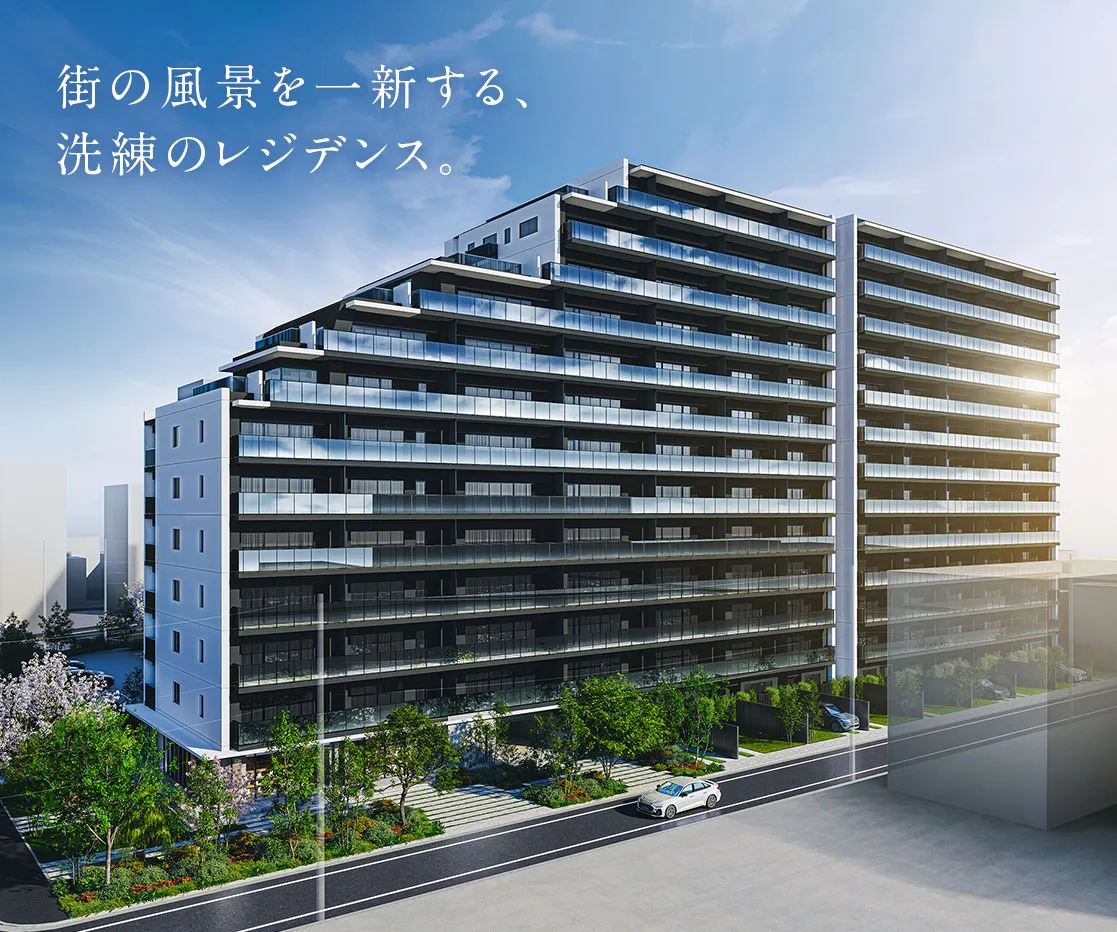 ※掲載の外観完成予想図は設計段階の図⾯を基に描き起こしたもので、形状・⾊等は実際とは異なる場合があります。形状の細部、設備機器等は表現していません。表現されている植栽は設計段階のものであり、変更になる場合があります。また葉の⾊合いや枝ぶりや樹形は想定であり、竣⼯から⽣育期間を経た状態のものを描いています。また特定の季節状態を⽰すものではありません。敷地周辺の建物などについては簡略化しています。
