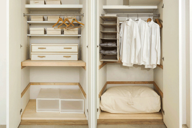 ◎大型の衣装ケースも収まる奥行きをもつ押入クローゼットは、中段の棚をすのこに。風通しがよく、湿気がこもらないので、布団を直接置くことができます。◎「家族全員が使いやすいこと」も、大切なテーマです。子どもの手が届く位置にハンガーを掛けるパイプを取り付けられるキッズクローゼットは、そのひとつ。お片付けの習慣づけにも役立ちます。