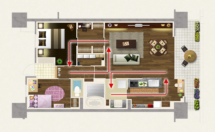 ふたつの赤い矢印は、人がぐるぐると回遊できることを表しています。これは、お部屋の行き止まり感をなくして、のびのびした暮らしを実感していただくための工夫です。また、最近増えてきた「夫婦それぞれがプライベートな空間を持ちたい」という声を受けて、ウォークインクローゼットの中には、ご主人がパソコンを広げられる書斎コーナーも設けています。そしてキッチンの横には、奥様の専用スペース、ミセスコーナーも。ちなみにキッチンは、夫婦ふたりが並んで料理できる広さで、バルコニー側の窓から常に明るい日差しが入ってきます。もちろん電子レンジや炊飯器など、必要なキッチン家電を置くスペースもしっかりと確保しています。