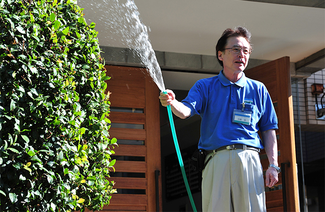 出勤は、朝9時前です。制服に着替えて、エントランスやロビー、駐輪・駐車場、植栽など外周りの清掃から1日がはじまります。それから、館内の清掃に。まずは、手すりや、共用廊下に面している各住戸周りを念入りに拭き掃除。これを、最上階の7階から順に全フロア行います。昼休みをはさんで、午後は床の掃き清掃です。やはり館内を上から下まで、全フロア。排水口やエレベータのマットなどもきれいにします。その後、エントランスやロビーのガラスをクリーナーで磨いて。風の強い日は枯れ葉などが飛んでくるので、もういちど外周りを掃き掃除します。夕方が近づくと、植栽に水やり。駐輪場の整頓、ゴミ置き場の清掃もします。これを欠かさず毎日。夏でも冬でも額に汗をかいて、やとさんは17時に勤務を終えます。