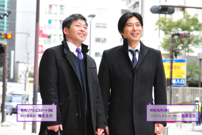 写真右側の男性は、新築のクリオマンションを販売する、明和地所(株)営業の垣屋。左側の男性は、現在ご自宅をお持ちで、買い替えのお客様を担当する、明和リアルエステート(株)営業の椎名。ふたりの営業担当が、明和地所グループの強みをいかし、よりよい住まいの購入をサポートしています。買い替えをご希望のお客様には、どういった売却方法が最適なのかを、新築マンションのご購入の相談と同時にご提案できます(売却のために、あらためて不動産会社に足を運ぶ必要はありません)。これは、明和地所グループ独自のサービスです。