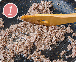 フライパンにごま油を中火で熱し、豚ひき肉を炒める。豚ひき肉の色が白っぽく変わったら、塩・こしょうをふる。