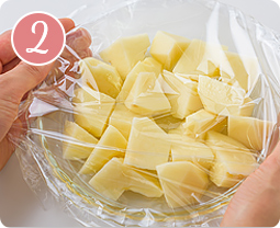 じゃがいもは、皮をむいて一口大の乱切りにし、耐熱容器に入れる。ふんわりラップをし、電子レンジで(500Wで約4分10秒、700Wで約2分50秒)加熱する。目安としては竹串がスーッと通ればOK。