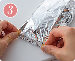 アルミホイルは鮭を包み込むように半分に折り、折り目以外の3辺を2、3回ずつ折ることで水が入らないようにすることができます。