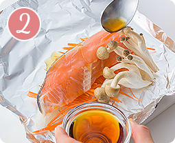 アルミホイルに、玉ねぎとにんじんのそれぞれ1/2を広げて敷き、さらにその上に生鮭1切れを、皮目を下にして載せる。しめじ1/2を載せて★を1/2かける。
