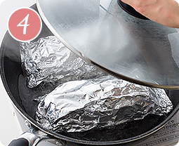 フライパンに【2】【3】を並べて置き、水150ml(分量外)を加えて強火にかける。沸騰したら蓋をし、さらに弱火で15分加熱する。