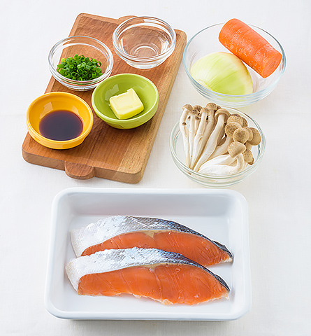 生鮭に、塩・こしょうを振る。玉ねぎは繊維を断つように薄切りにし、にんじんは千切りにする。しめじは石づきを取り、小房に分けておく。