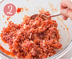 合挽き肉はしっかり解凍しないと中まできちんと火が通りにくくなるため、冷凍保存していた場合は冷蔵庫に移して自然解凍してから加熱してください。