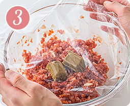 耐熱容器に合挽き肉・【1】・★を入れ、よく混ぜ合わせる。