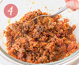 【3】フライパンにオリーブ油小さじ1を熱し、合挽き肉と【1】を炒める。