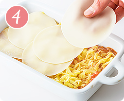 耐熱容器に、ピザ用チーズ1/3量を敷いた上に、餃子の皮5〜6枚をまんべんなく敷き、その上に【3】の1/3量 の順に重ねる。これをもう1セット重ねたら、一番上に残りのピザ用チーズを散らす。