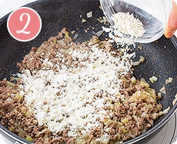 フライパンにサラダ油を敷き中火で熱し、【1】と合挽き肉を入れて炒める。合挽き肉の色が変わったら、薄力粉を加えて、粉っぽさがなくなるまで炒める。
