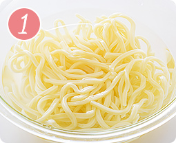 冷凍うどんは、袋の表示通りにレンジで解凍し冷水でしめる。