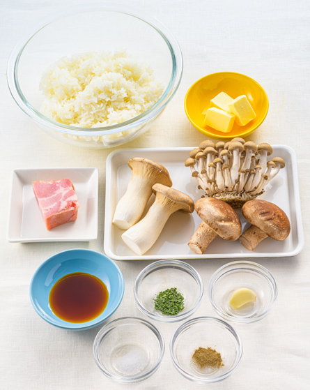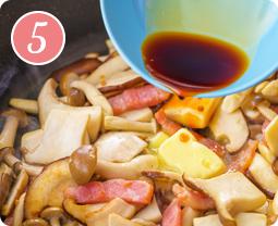 【4】に全てのきのこを加えて炒め、きのこがしんなりとしたらバター10gとしょうゆを加えて炒め合わせる。