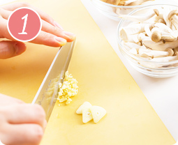 エリンギは長さを半分に切り、5ミリ程度の厚さに切る。しいたけは石づきを落とし、薄切りにする。しめじは石づきを落として手でほぐす。にんにくは、にんにくチップ用に3枚程薄切りにし、残りをみじん切りにする。