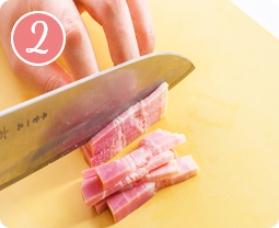 ベーコンは短冊切りにする。
