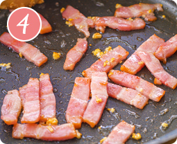 【3】のフライパンでにんにくのみじん切りを炒め、香りが立ってきたらベーコンを加えて炒める。
