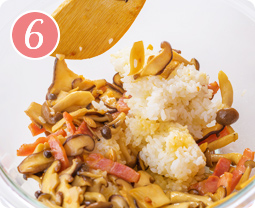ボウルに温かいごはんを入れて、【5】と残りのバターを加えさっくりと混ぜ合わせる。塩、こしょうで味を整え、器に盛りつける。