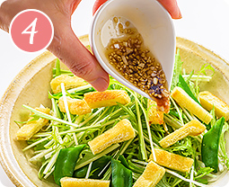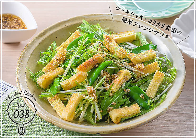 あっさりとした水菜にこんがりと焼いた油揚げを合わせ、風味豊かな香味ダレをかけた簡単なアレンジサラダです。絹さやのほんのりとした甘みと食感もアクセントになっています。