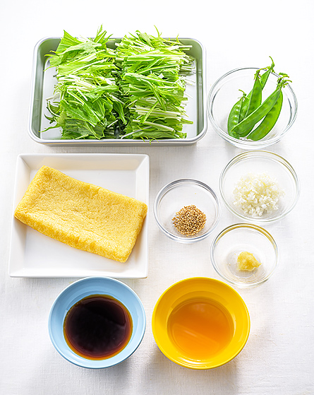 あっさりとした水菜とカリカリの油揚げに、絹さやのほんのりした甘みとシャキっとした食感がアクセントになります。