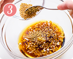 【1】、【2】を合わせて器に盛り付け、【3】の香味ダレをかける。