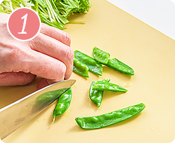 絹さやは筋を取り除いて熱湯でさっとゆで、斜め半分に切る。