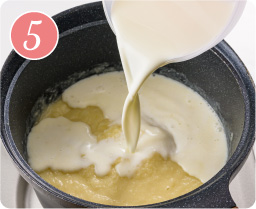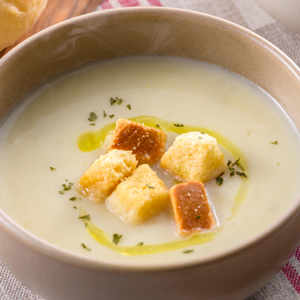 牛乳を少しずつ加え、お好みの滑らかさになるまで温める。塩少々(分量外)で味を調え、器に盛り付ける。クルトンをのせてパセリ(乾燥)を散らし、オリーブオイルを回しかける。