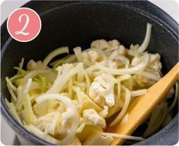新じゃがいもは皮をむき約8mm厚さのいちょう切りにする。カリフラワーは小さめの小房に切り分ける。茎の部分も小さめのひと口大に切る。玉ねぎは3mm幅の薄切りにする。