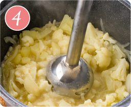 木べらでカリフラワーや新じゃがいもが潰せるくらい柔らかくなったら火を止め、粗熱を取り、ミキサーかブレンダーで滑らかになるまで混ぜ合わせる。