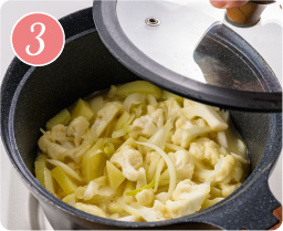 【2】に【A】を加え、ふたをして弱火で5~6分煮る。