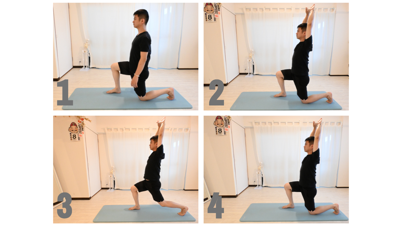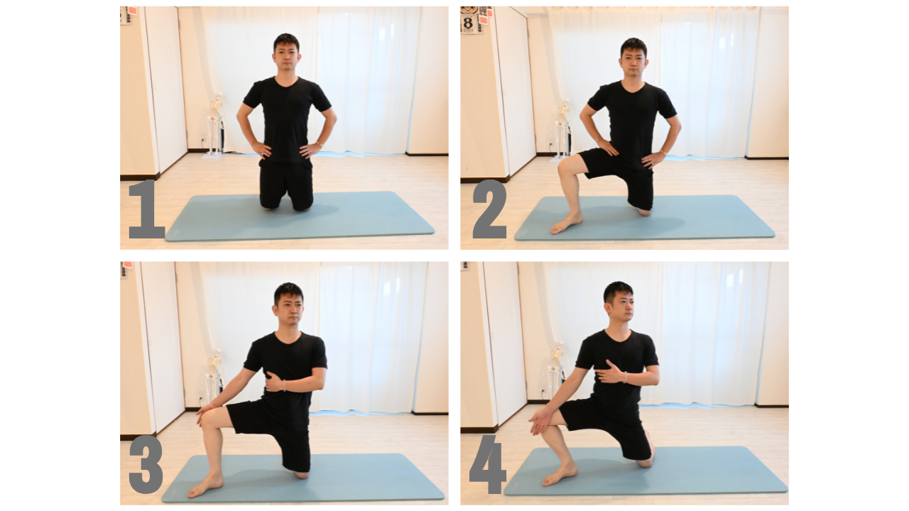 1.膝立ちから左足はつま先を立て、右足を一歩前へ踏み出します。