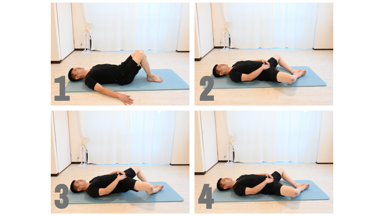 1.仰向けになり両足を床につけて、膝を90度に曲げます。